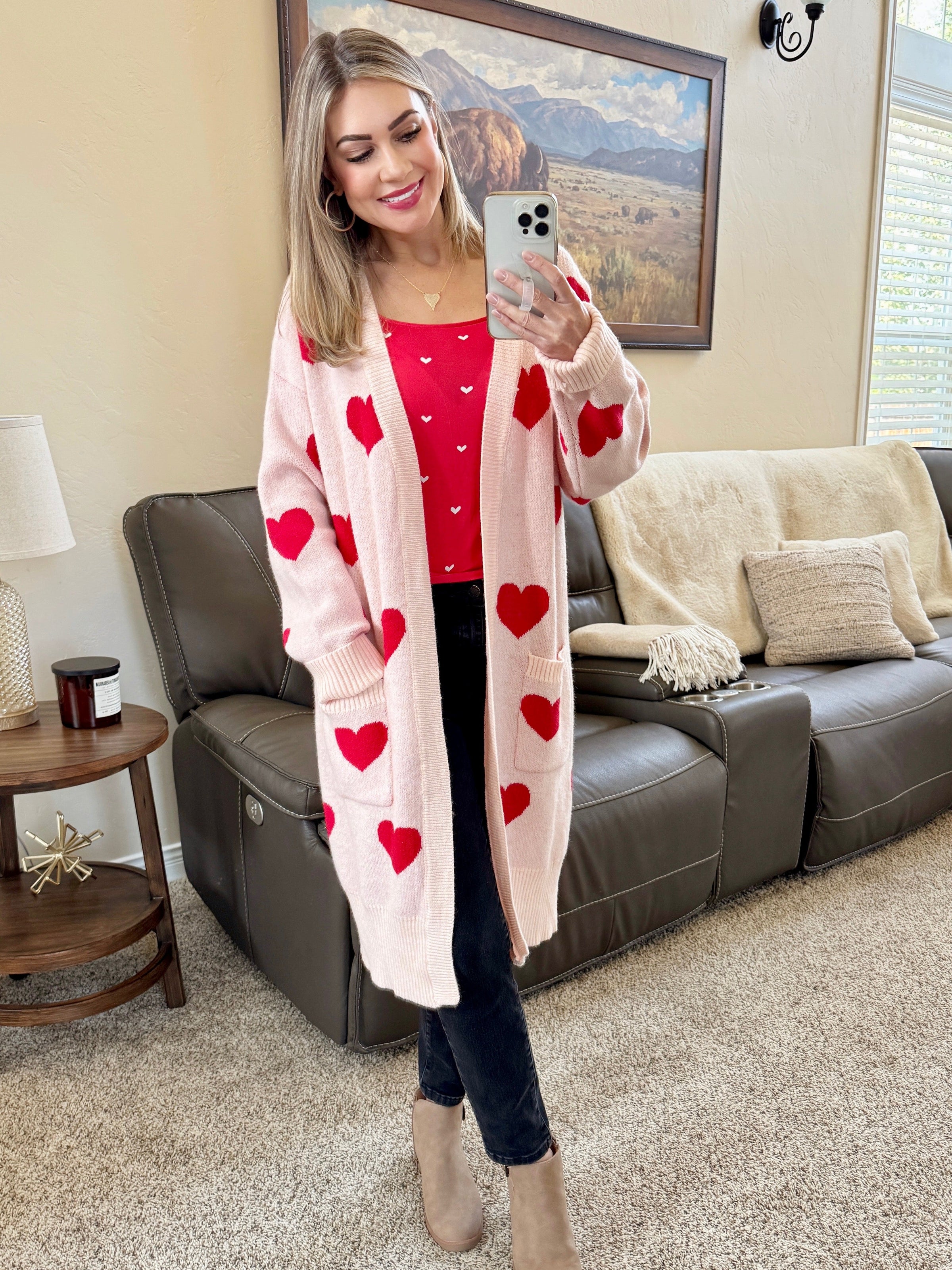 Wrap yourself in cozy charm with the Love Story Cardigan. Featuring a soft blush base adorned with playful red hearts, this open-front cardigan adds a sweet touch to any outfit. Convenient pockets keep your essentials close, while the relaxed fit invites comfort and warmth. Perfect for Valentine’s Day or anytime you want to wear a little love.